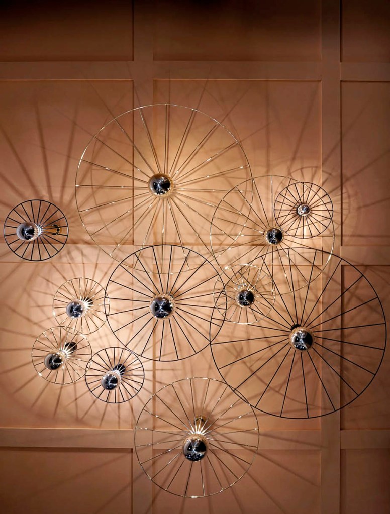 Otra composición de sombras y luces de diferentes tamaños y distintos acabados en oro, cobre y negro. Todos estos apliques son perfectos para dar a esa pared de la entrada, del salón o del distribuidor un toque original y diferente.