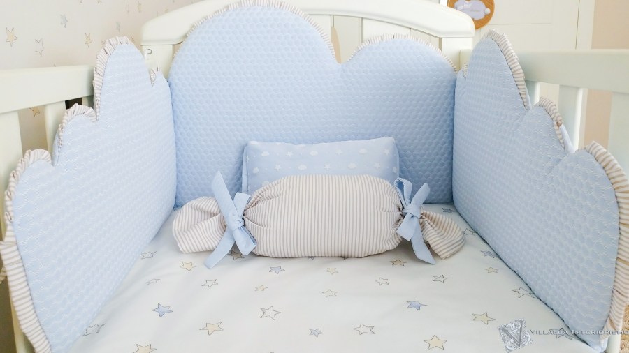 También de rayitas en beige, hicimos el caramelo con lazos en azul. Complementa la cuna otro cojín de tul con estrellas y nubes forrado en azul.