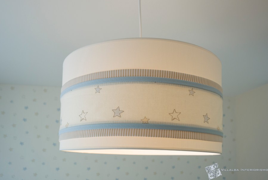 La protagonista de la habitación de Andreas es la cuna, que vestimos con un coordinado de preciosas telas. La colcha nórdica blanca estampada de estrellas en azul y beige, acabada por un bordón a rayitas beig, con esa misma tela hicimos el pequeño volante de la parte de arriba de la chichonera y los lazos.