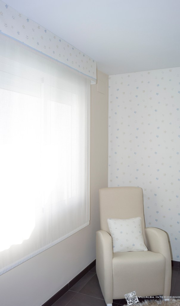Otros complementos, como el papel pintado con estrellas igual que la colcha de la cuna, la lámpara que le hemos colocado el detalle de las estrellas, el sillón balancín con su cojín de estrellas, el volante del stor acabado igual que la lámpara, el cambiador de piqué azul y la alfombra redonda de pelo largo, hacen que la habitación de Andreas quede delicada, cómoda y bonita.