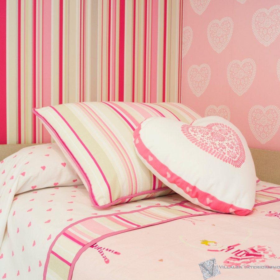 Combinamos un papel pintado de rayas y otro de corazones, para darle vitalidad a dos paredes de la habitación, el resto blancas, igual que la cortina que lleva unos discretos bodoques bordados en rosa que colocamos con una barra.