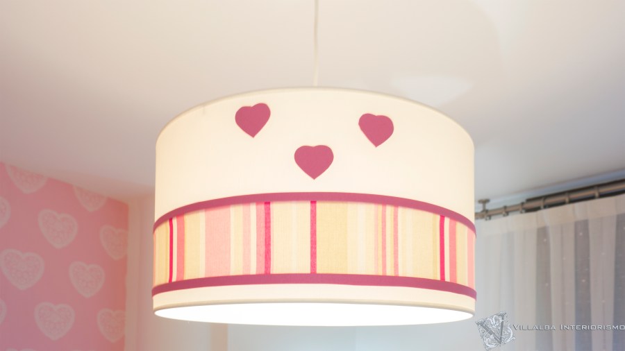 La lámpara de techo la personalizamos con la tela de rayas y unos corazones en rosa, son detalles que quedan originales y diferentes, igual que el cojín en forma de corazón con un corazón bordado.