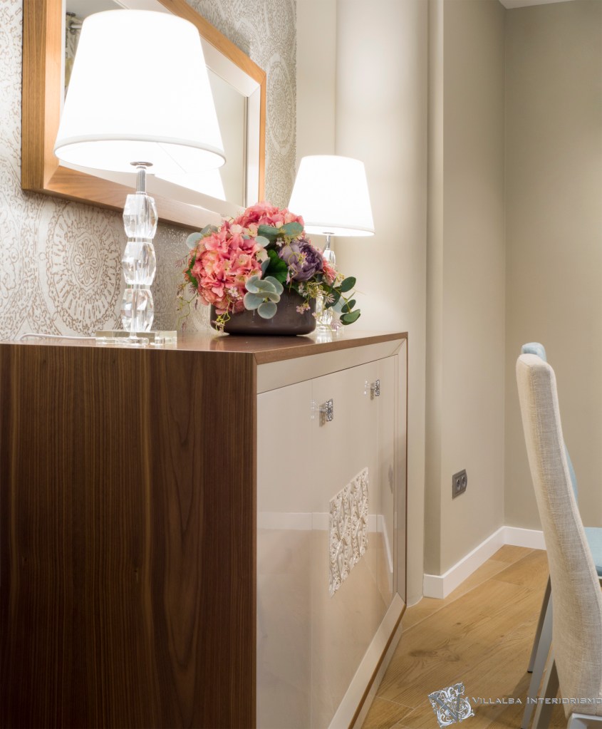 También colocamos un bonito y discreto papel pintado con dibujo, textura y brillo en las paredes del mueble de TV, y en la zona del comedor, en la pared del aparador para resaltar los muebles.