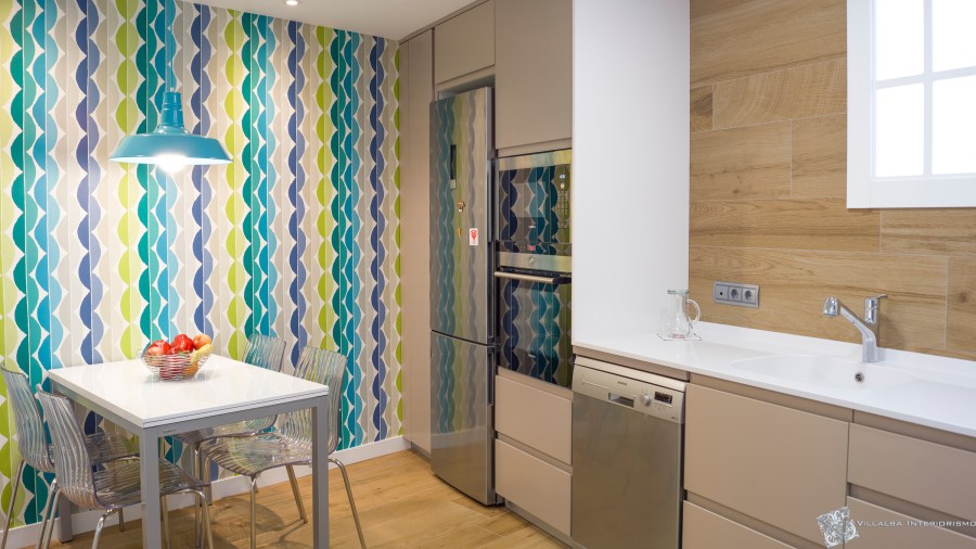 La cocina quedó así de alegre con el papel pintado que colocamos en la pared y la lámpara de techo en color azul. En la ventana y puerta colocamos unos estores con unas finas rayitas.