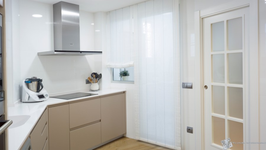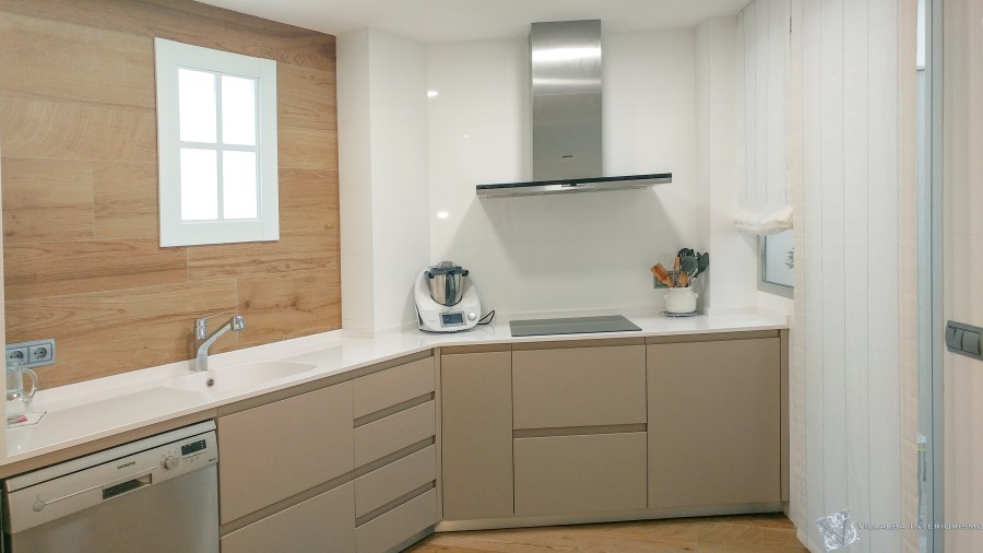 El aparador del comedor y los muebles de la TV los combinamos con el armazón de madera nogal y las puertas lacadas en arena brillo, una combinación moderna, luminosa y, al mismo tiempo, con un punto de calidez.