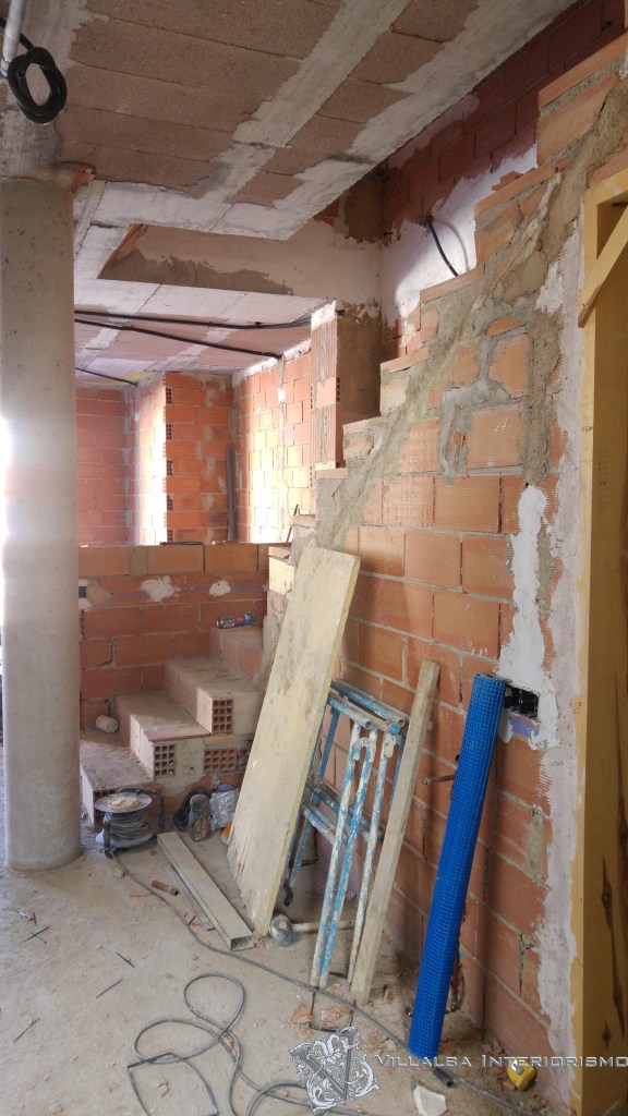 Toni mi marido, cogió medidas de toda la casa y se puso a trabajar en el ordenador, plasmando medidas, colocando materiales y texturas, diseño de cocina y baños, distribución de muebles,… haciendo imágenes renderizadas en 3D y dando forma al precioso proyecto que teníamos en nuestras manos, un trabajo muy laborioso pero muy eficaz, para que el cliente visualice su casa antes de empezar a hacer nada. Te dejo un ejemplo de lo valioso que es el hacer las imágenes en 3D en los proyectos, son 3 imágenes de la misma zona del salón, ésta a pie de obra al empezar el trabajo.