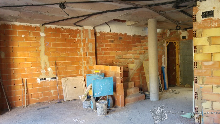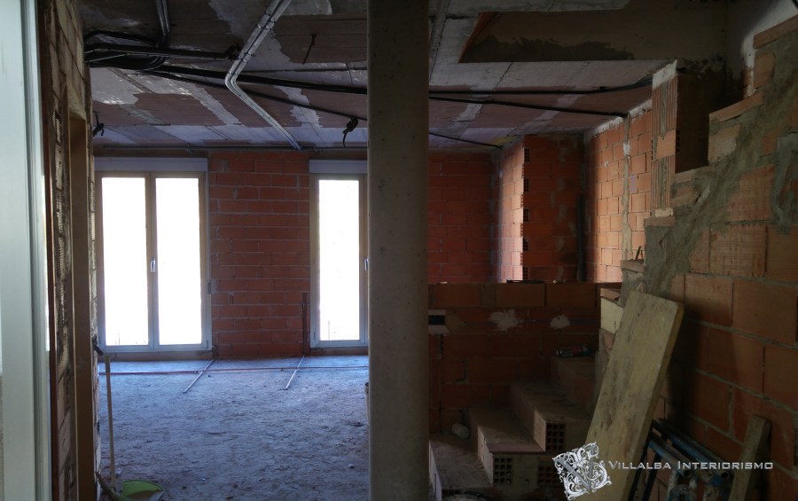Es un proyecto donde tuvimos que elegir todos los materiales de la casa, el pavimento y el revestimiento de los baños y cocina, que por cierto, son de la prestigiosa empresa de Vila-real Porcelanosa. Te dejo las primeras imágenes del salón cuando lo vimos por primera vez… ¡Había mucho trabajo por hacer!