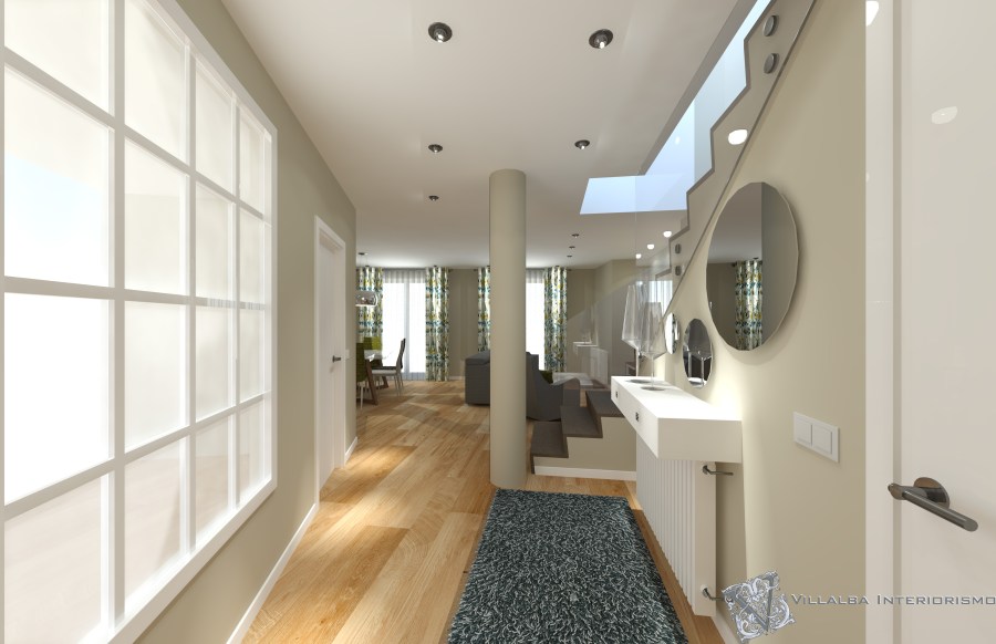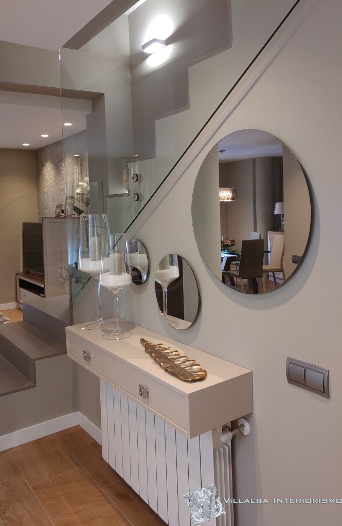 La decoración del recibidor fue muy limitada porque era muy reducido, en la única pared que había para poder colocar un mueble había un radiador y además era la subida de la escalera, así que, optamos por colocar un pequeño mueble a medida encima del radiador con 3 espejos redondos de distintas medidas.
