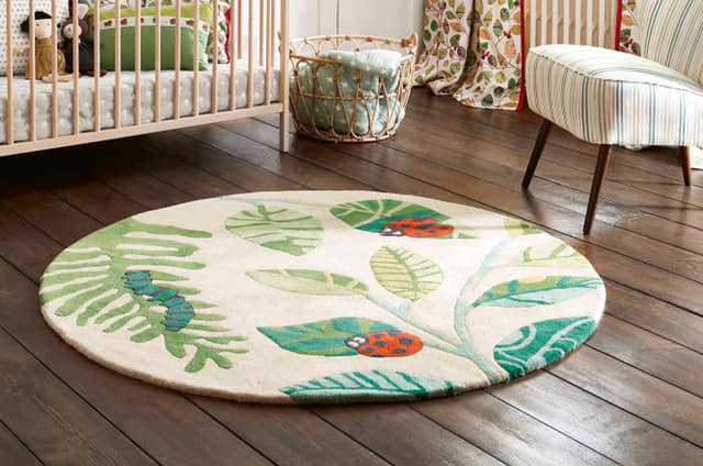 La alfombra es complemento de decoración casi imprescindible en la habitación de los peques, y ésta de esta colección es redonda de 140 de diámetro con un diseño de bonitas mariquitas que se arrastran felizmente sobre las hojas estampadas, mientras que una oruga mira de cerca.