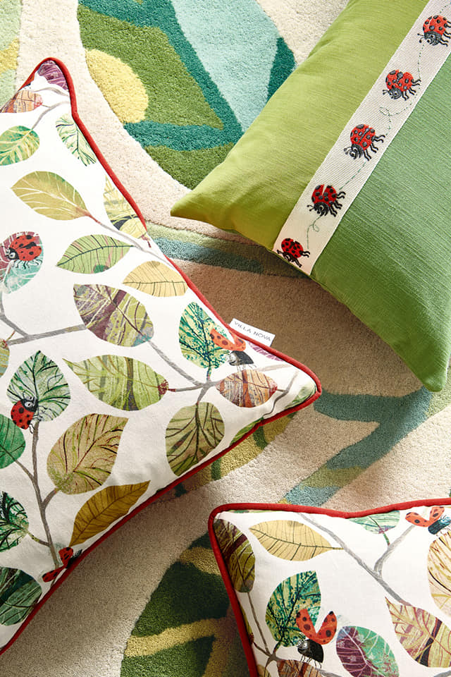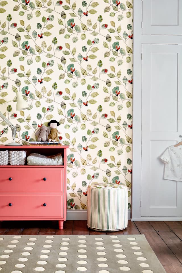 La tela de las cortinas y cojines tienen el mismo diseño que el papel pintado, pero más lleno de hojas verdes y graciosas mariquitas con las alas rojas y lunares negros. También se puede con esa tela confeccionar la colcha y el protector de la cuna.