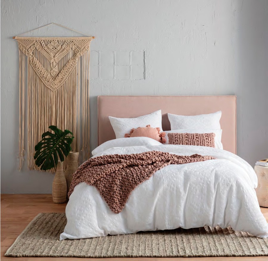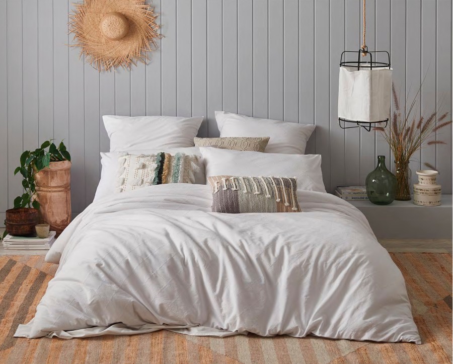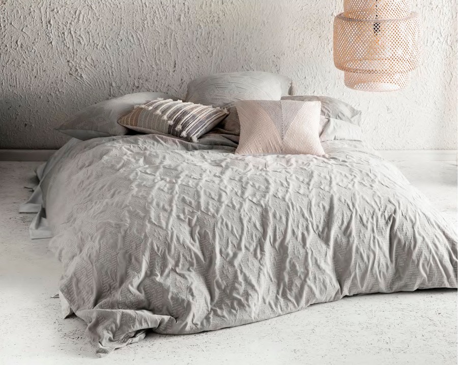 Un tejido original, con efecto arrugado y un diseño ikat junto con un bonito y neutro color piedra es una funda nórdica acogedora y con sensación de relax.