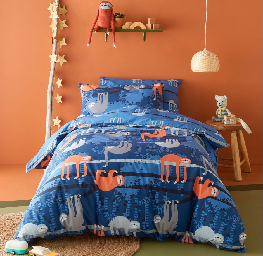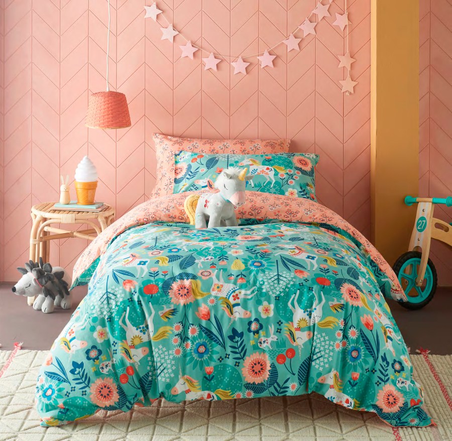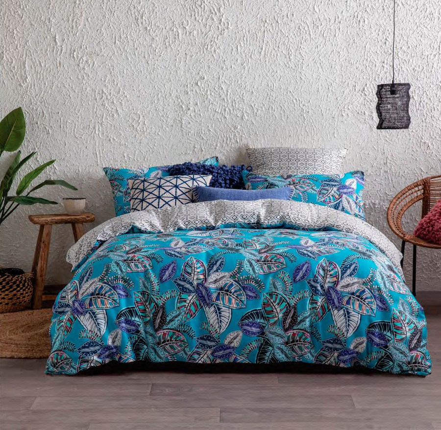 Si te apetece darle un aire tropical que tanto se lleva esta temporada a tu dormitorio, con esta funda nórdica seguro lo consigues, es una mezcla de hojas exuberantes de helechos en varios colores verdes y azules, y unos toques de coral por las orquídeas que se entremezclan. Es reversible con un suave estampado también en hojas en gris.