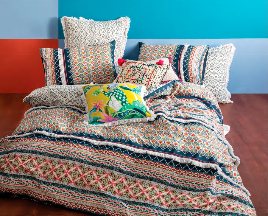 Esta funda nórdica es para conseguir en tu dormitorio un look alegre con aires exóticos, estampados con motivos étnicos inspirados en las tribus, con toques sofisticados por los detalles de los flecos blancos. El revés de la funda nórdica es un estampado ikat en blanco y negro muy bonito. Por su estampado y colorido se hace para todas las medidas de cama de 90, 105, 135, 150 y 180.