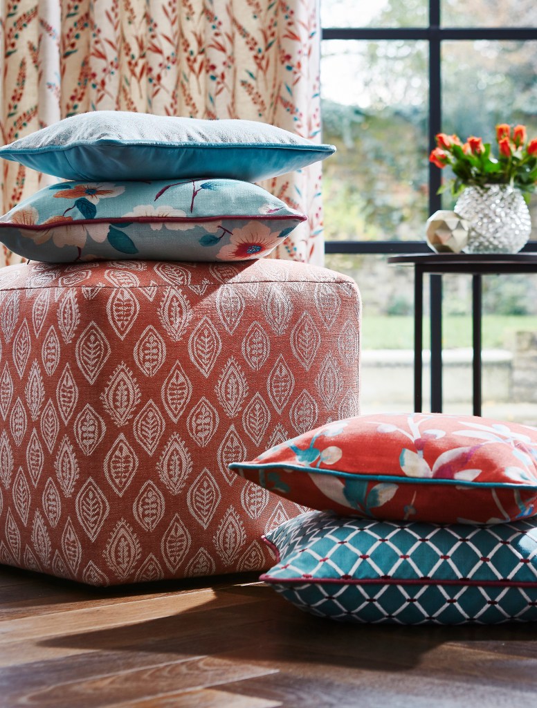 La mezcla de cojines de distintas telas con las texturas, estampados y colores queda un contraste atrevido, además la combinación de turquesa y naranja quemada es una mezcla de colores que se complementa muy bien.