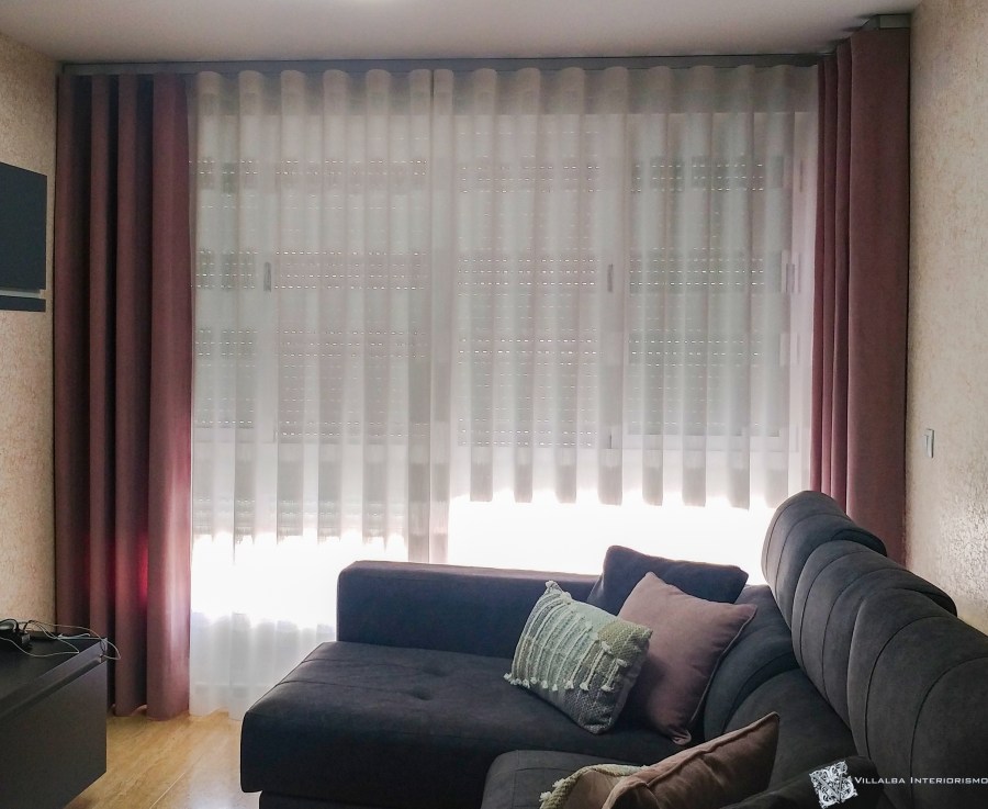 Todas las cortinas las colocamos con unos rieles decorativos acabados en acero y en onda perfecta, que seguro habrás ya oído hablar de este sistema. Nosotros en el mismo riel decorativo colocamos el visillo y las dobles, y queda así.. ¡De estupendo!