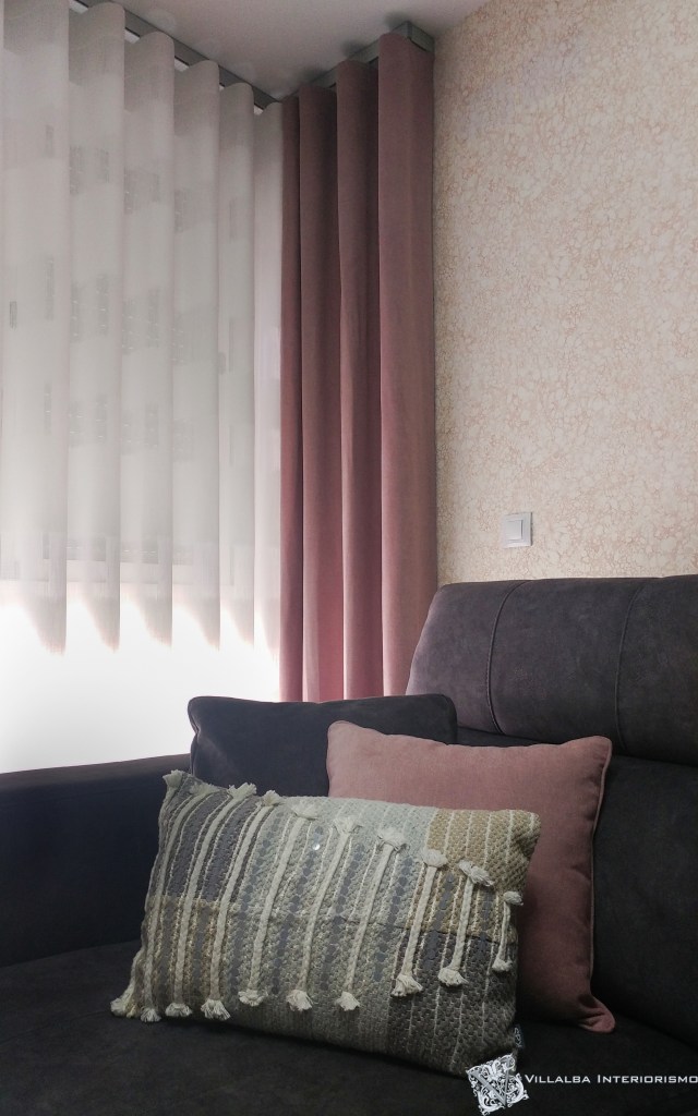 En el salón el tejido elegido para las dobles cortinas y cojines fue uno liso muy suave y agradable en color rosa, que contrasta con el sofá oscuro y el resto del mobiliario, también con el visillo blanco a rayas horizontales, que tan bien queda para el sistema de onda perfecta. Además en el sofá colocamos otros cojines en tonos neutros con unas fantasías de trencitas y flequitos… ¡muy monos!
