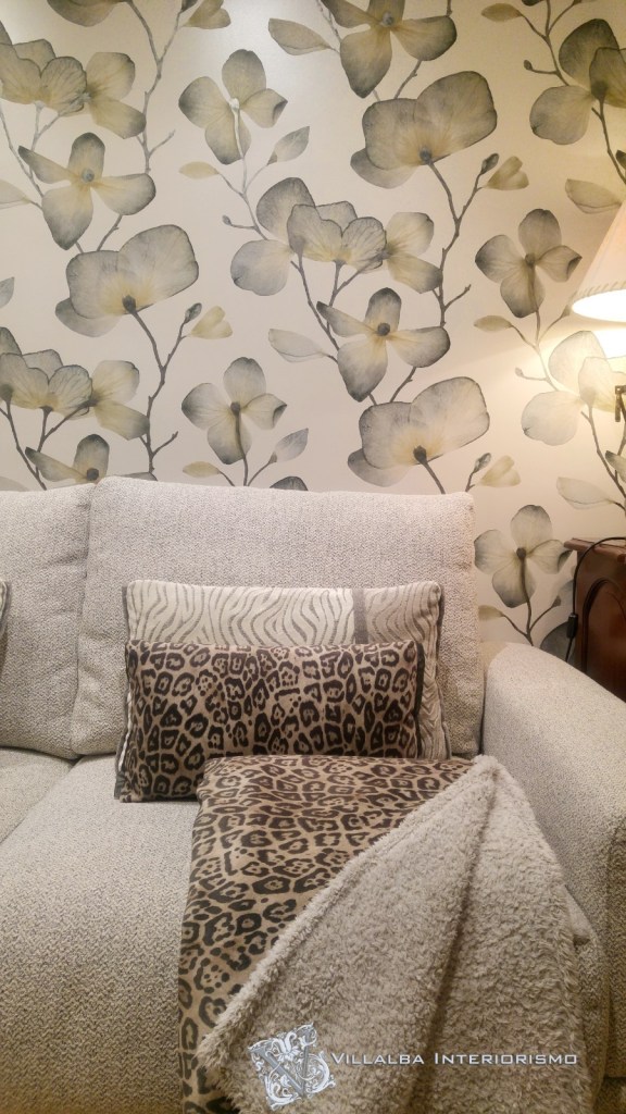 El estampado de leopardo es muy fácil de combinar con otros estampados y texturas, como en este salón en el que colocamos un papel pintado de flores grandes y otros cojines de terciopelo con otro dibujo, queda una combinación original y con personalidad.