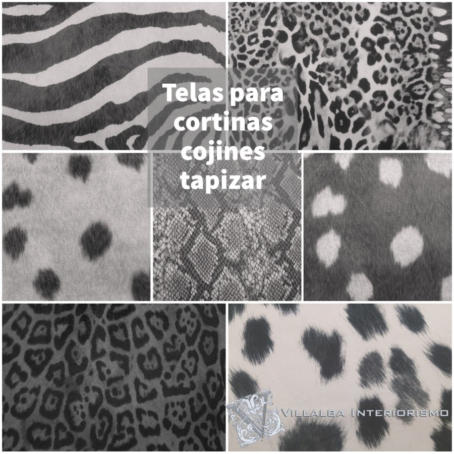 Una bonita colección de telas de distintos estampados de animales con las que hacemos dobles cortinas, cojines y plaids, también tapizamos sillas, sillones, banquetas, cabezales,…