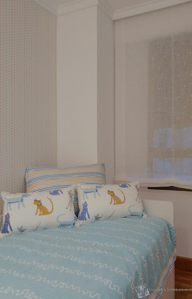 En la cama, le colocamos una funda nórdica con una preciosa tela color turquesa bordada en blanco, y los graciosos cojines con gatos estampados y bordados, completan el look con un cojín a rayas.