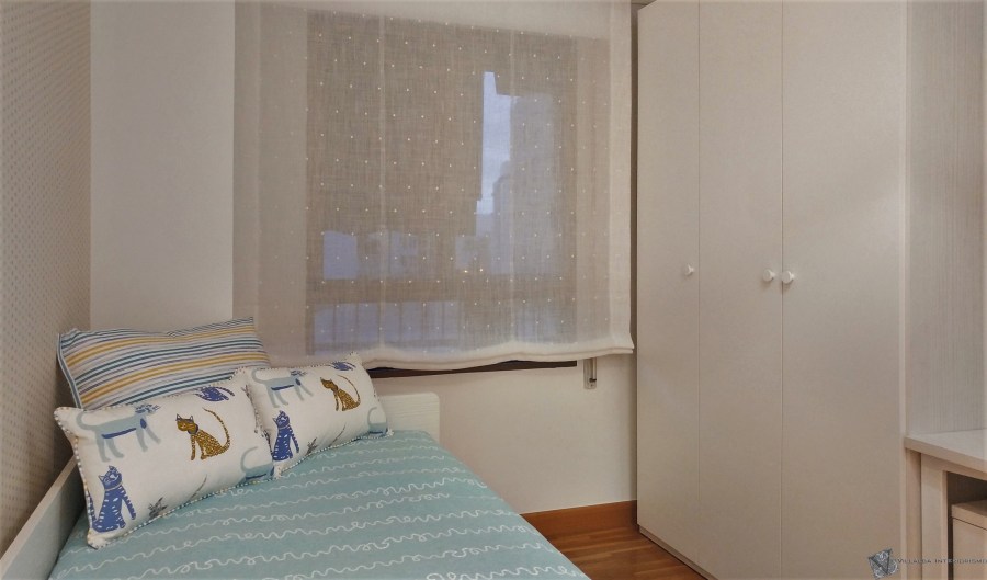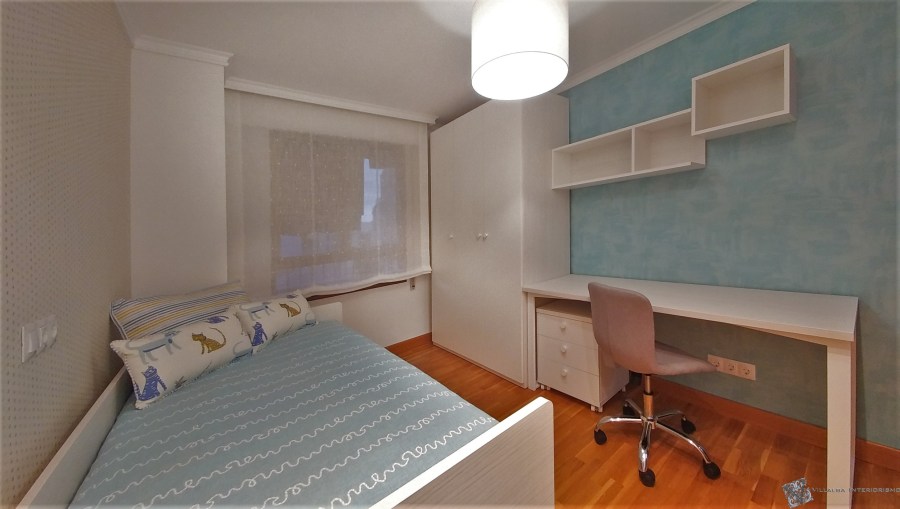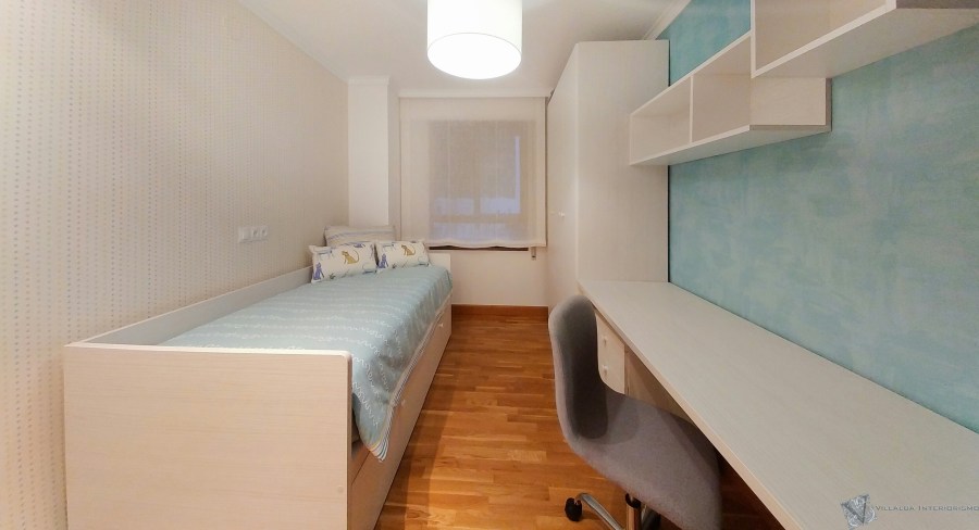 Es una habitación pequeñita pero le hemos sacado el máximo partido, lo tiene todo, un armario de 3 puertas, un buen escritorio, la cama nido y bajo 2 cajoneras con ruedas para almacenamiento. Todos los muebles son de madera acabados en un color claro y combinado en blanco lacado en las puertas y cajones.