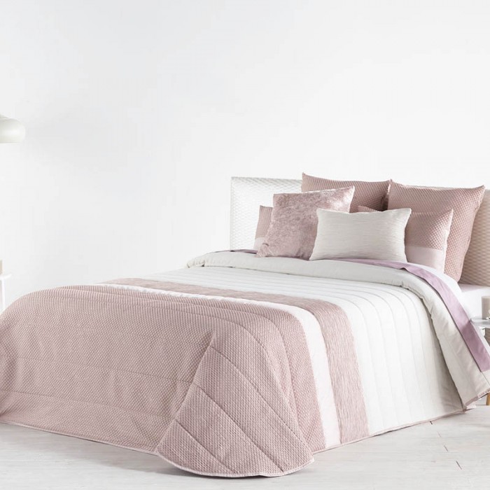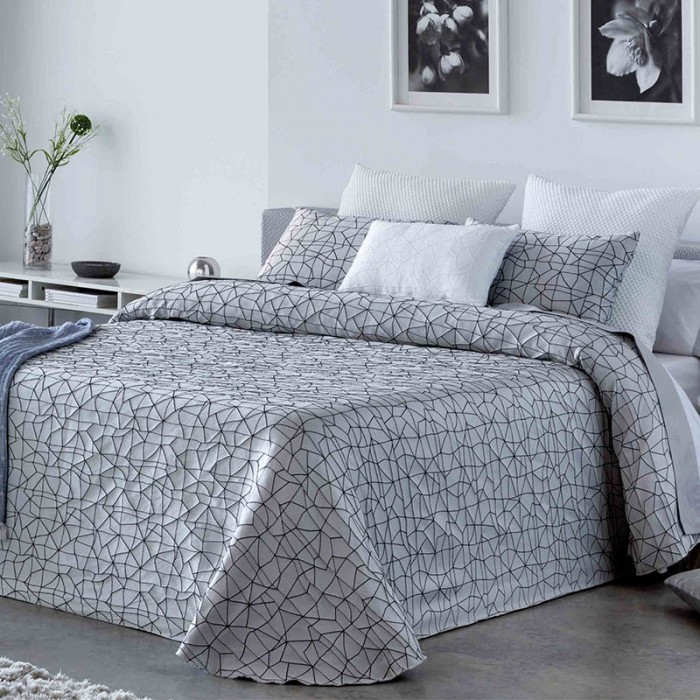 Los tejidos suelen ser de piqué o jacquard. El piqué es un tejido con un poco de relieve que se consigue con los hilos al fabricarla, tiene variedad de dibujos, todos muy pequeños, en forma de canutillo, nido de abeja, rombos,… El jacquard es un tejido que mediante unos hilos de distintos colores se teje formando dibujos, con ello se consiguen diseños decorativos, texturas y colores, más originales que el piqué. Estas colchas al ser tejidas, sí están confeccionadas con un bies bajo, suelen ser reversibles, así que, tienes 2 colchas en una, como ésta con un bonito dibujo geométrico.