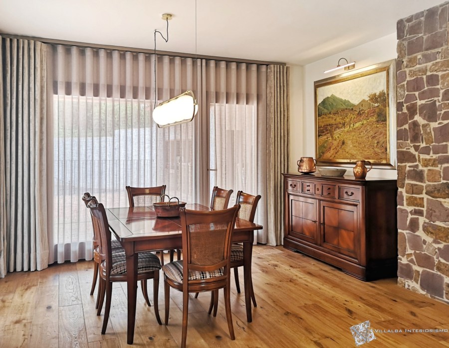 Este salón comedor como ves, está decorado con materiales y elementos muy en conexión con el exterior, como la madera y piedra, lo cual lo tenía muy claro Juan desde el principio de la obra.