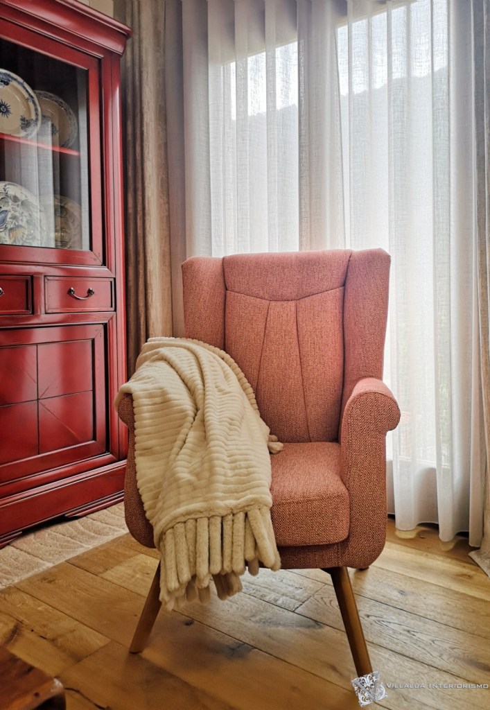 En la zona del salón le colocamos 2 sofás a medida con una tapicería en color claro y 1 sillón, destaca en el conjunto una vitrina también en cerezo macizo francés y pátina anticuario acabada en rojo, es la protagonista del salón. La iluminación discreta en 2 colgantes.