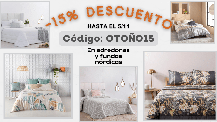 Recuerda que tienes de plazo hasta el 5 de noviembre para beneficiarte del descuento del 15%, y tienes que poner en el código OTOÑO15 y para que tu amig@ o familiar también se pueda llevar el 15% de descuento, tiene que poner al hacer el pedido el código OTOÑO15, anda, no pierdas el tiempo y díselo, le ayudarás a tener también su dormitorio cálido y acogedor, ¡y a buen precio!