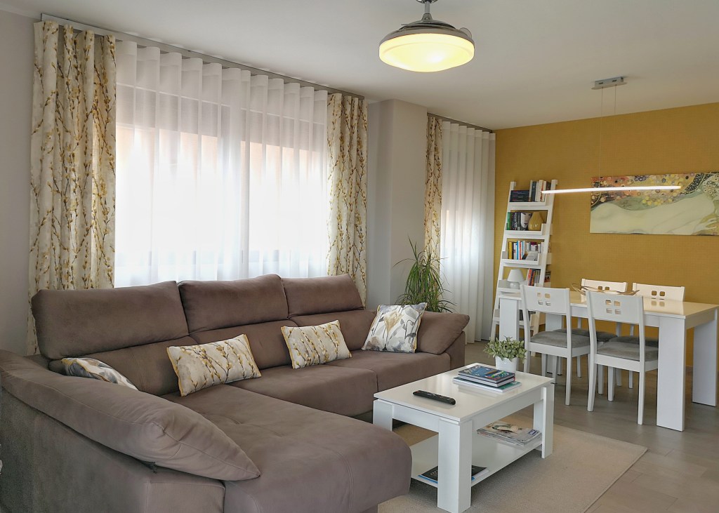 Las dobles cortinas van genial para añadir este toque personal que le quieras dar a tus ambientes, con estampados o dibujos que sean de tu gusto. Esos tejidos también los puedes utilizar para tapizar algún sillón o sillas, e incluso para hacer cojines o plaids.