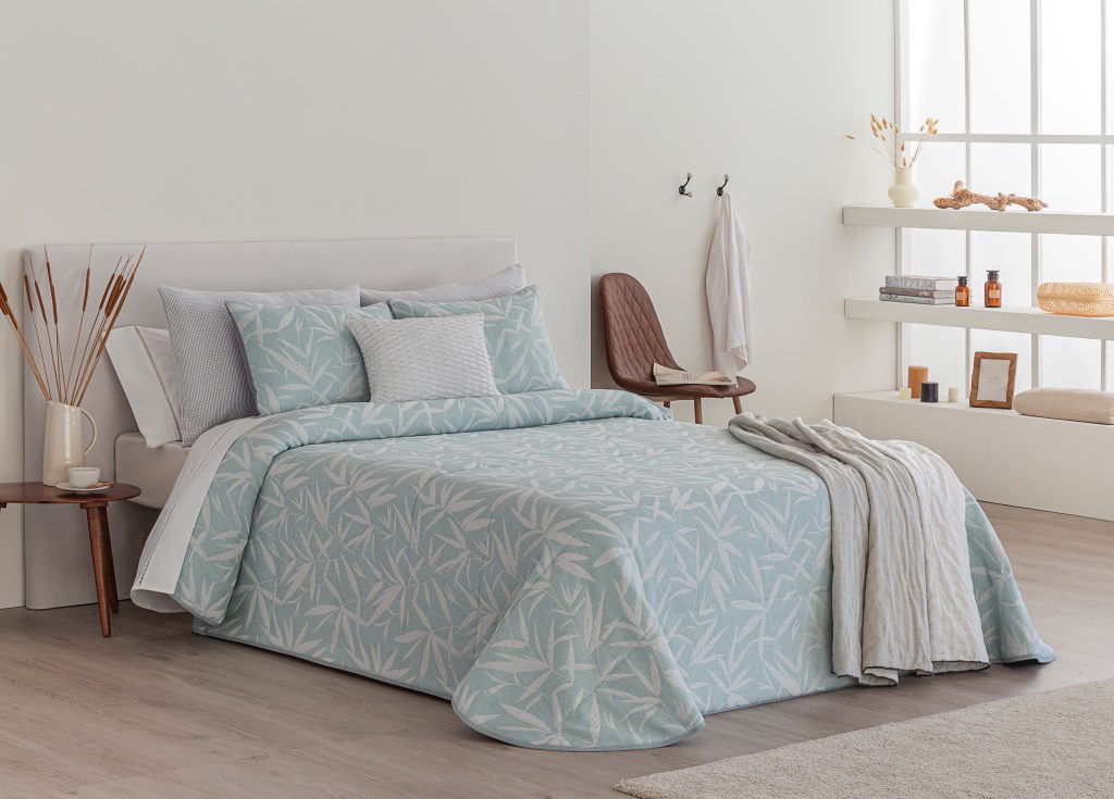 Sumérgete en la suavidad de los tonos pasteles, desde el romántico rosa hasta el refrescante verde y el sereno azul, como esta colcha bouti en color agua y un discreto y moderno dibujo de hojas.